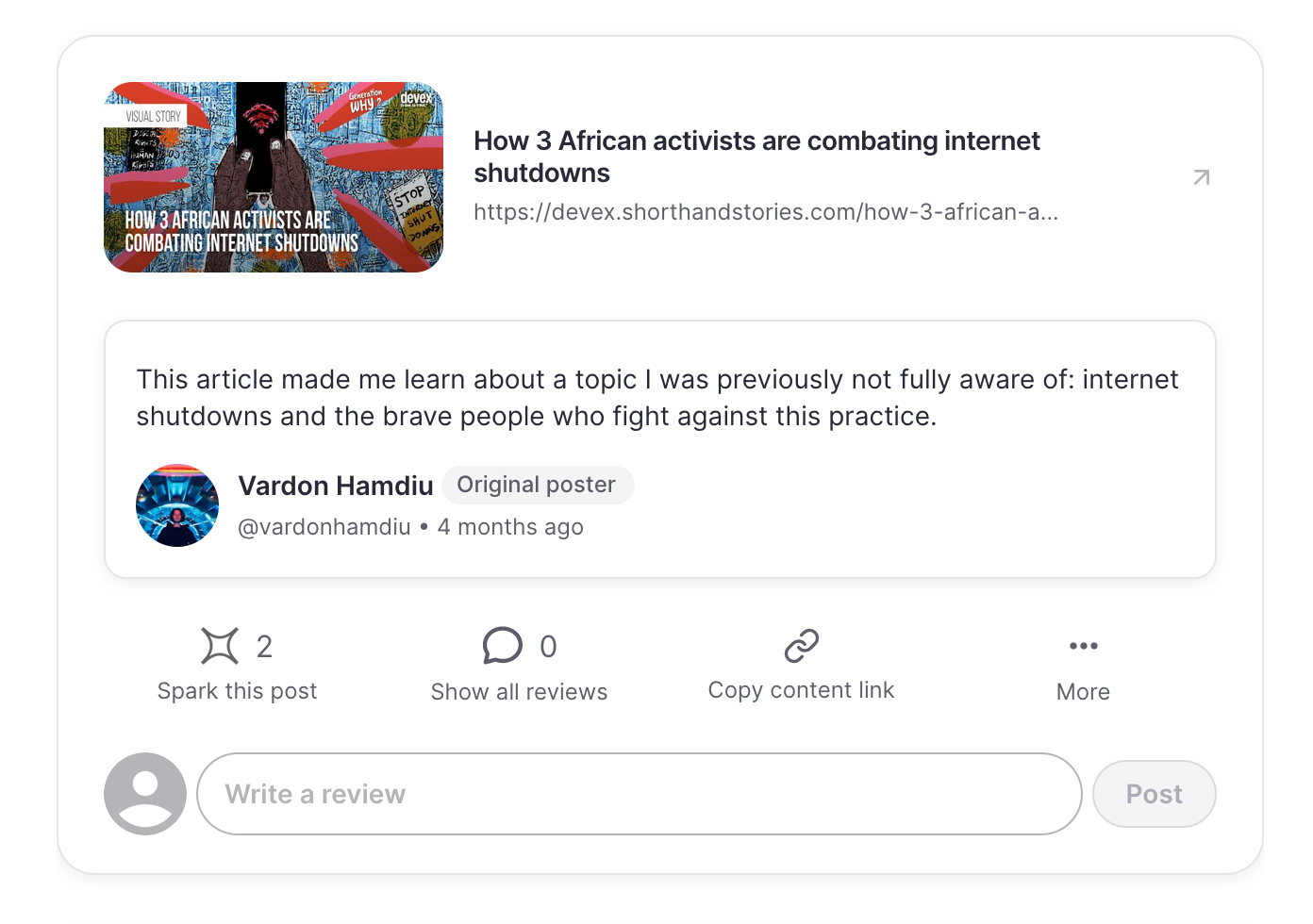 β’ Sparkable's design disincentivizes self-promotion, which might result in fewer posts, but the quality of the posts should be higher.